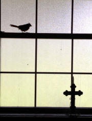 our 12 year old toy poodle, who is diabetic and also has a seizure disorder, has to go outside often to do her "business". We leave our patio door open about 5-6 inches so that we don't have to constantly open and close it. We have been pleasantly surprised that one of our birds that frequents the feeder has decided to take advantage of the air conditioning. She has decided to boldly fly and hop through the opening and just make herself comfortable. She hops around under the kitchen table and eats crumbs that Dad tends to drop and then now has expanded her territory and goes all over the house. She is not scared of us and has even hopped right past our dog. She goes all over the house and we have to make sure she is not "hiding" before we leave the house or lock the doors to go to bed! The photo I took of "MOMMA LUCY" is her on the bathroom window ledge. I guess she is even "potty trained" since you can see the bird dropping on the window in the BATHROOM, of course! The only time I felt like putting her in "time out" was when she kept landing on my GONE WITH THE WIND collectible plates in one of the bedrooms. I don't know if she is running away from an abusive husband, thinks we are a halfway house, or just likes baseball! I'll keep you posted in the next NEWSLETTER!